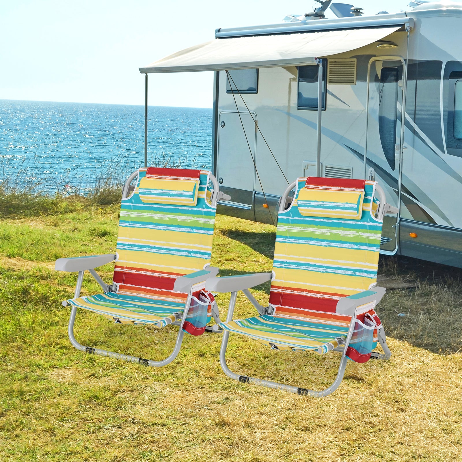 1 Piece Foldable Backpack Beach Chair with Cup Holder and Storage Pockets for Outdoor-Multicolor