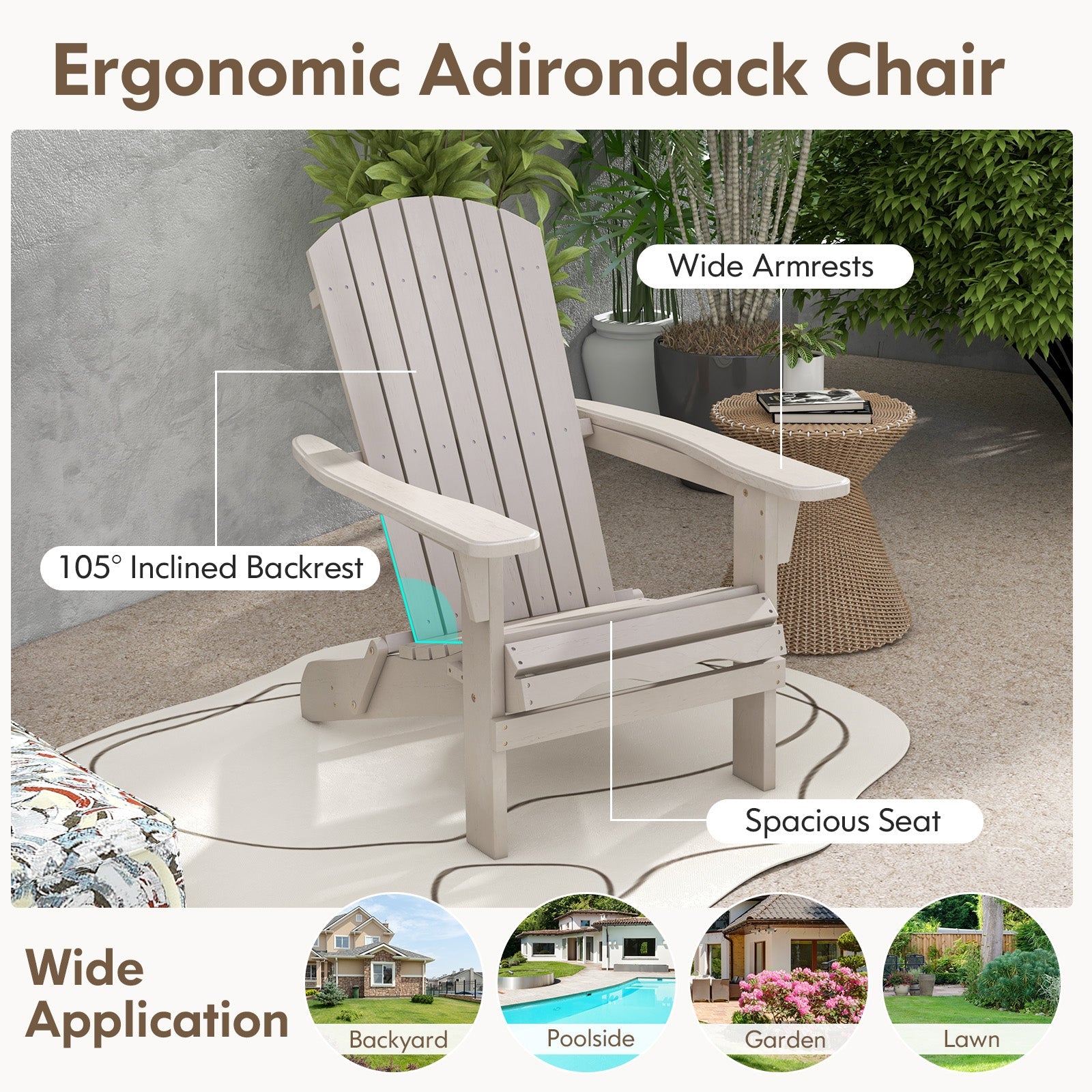 x● Made of high-quality fir wood for long-time use● Protective paint finish extends the chair's life● Ergonomic design ensures ultimate sitting comfort● Foldable feature makes storage and transport easy● Wide and inclined backrest supports your posture● Slatted seat design prevents water accumulation● Reinforced crossbar significantly boosts stability● Ideal for lawn backyard poolside and so on Installation guide