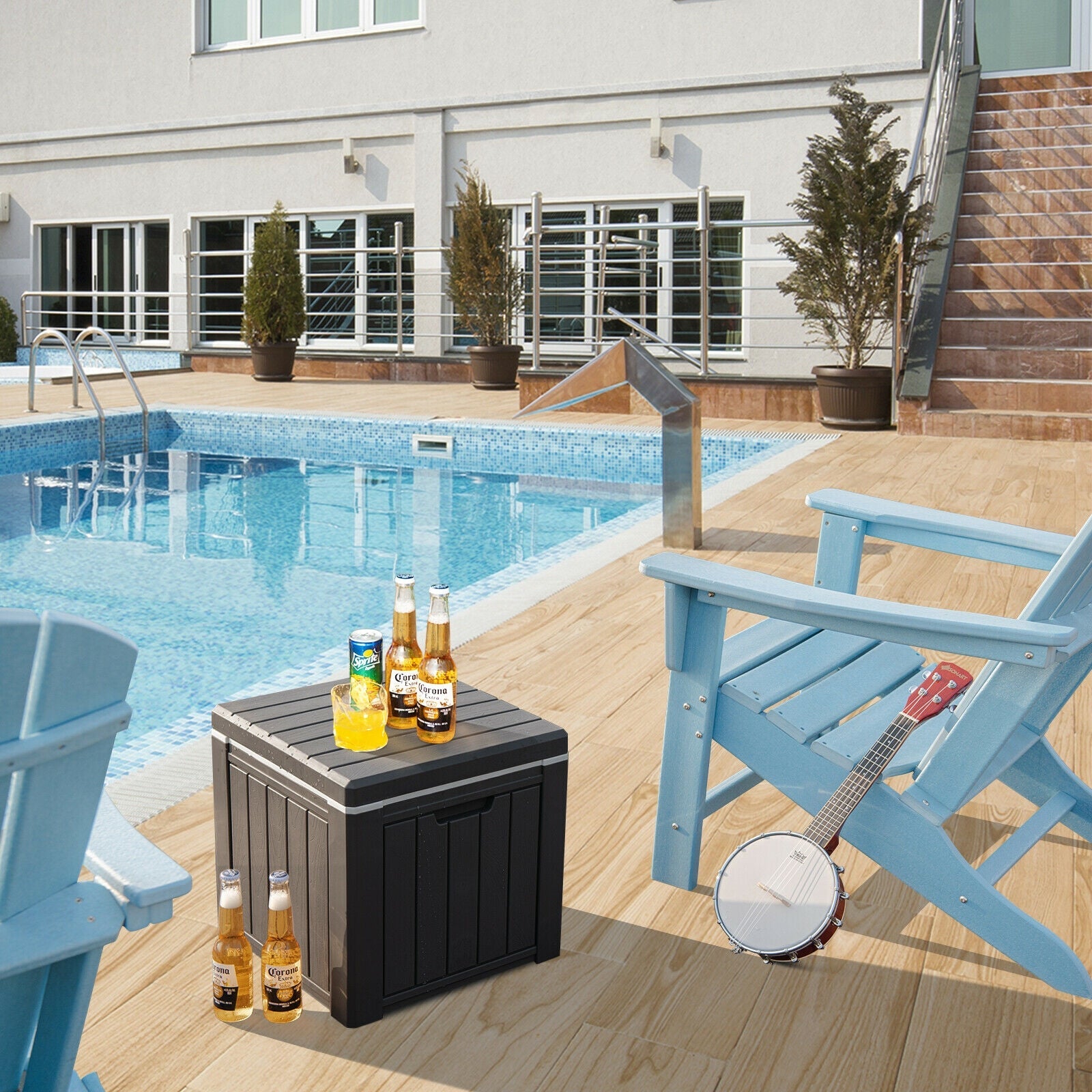 xThis 3-in-1 multipurpose ice cooler is a good choice for outdoor time. With large storage capacity and good sealing this 10 gallon no-need-plug-in ice cooler can keep your drinks cool for more than 24 hours making it a useful companion for BBQ family gathering camping fishing and more. Meanwhile you can use it as a cocktail side table or a stool to make your outdoor activities more convenient. Besides the compact cooler weighs only 8 lbs and is designed with built-in handles so you can easily carry it anywhere you go. Furthermore the PP material has great durability and water-resistance allowing you to use our ice chest for many years. If you are looking for such an ice cooler do not hesitate to take it to your home! Perfect ice retention to keep drinks cool more than 24 hours 10 gallon (37 L) storage capacity is enough for daily use Convenient to take out drinks due to the removable lid 3-in-1 design includes cooler side table and stool 220 lbs weight capacity and non-slip base for safe sitting Lightweight and portable design suitable for various outdoor activities PP material is waterproof for outdoor use Exquisite wood texture adds stylish sense to outdoor space No installation requirement to save your time