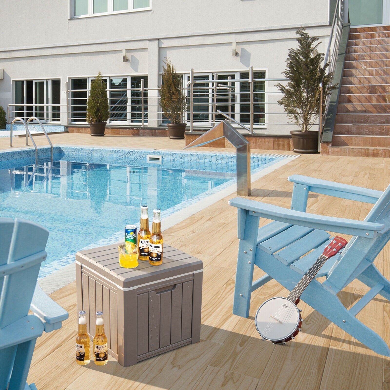 xThis 3-in-1 multipurpose ice cooler is a good choice for outdoor time. With large storage capacity and good sealing this 10 gallon no-need-plug-in ice cooler can keep your drinks cool for more than 24 hours making it a useful companion for BBQ family gathering camping fishing and more. Meanwhile you can use it as a cocktail side table or a stool to make your outdoor activities more convenient. Besides the compact cooler weighs only 8 lbs and is designed with built-in handles so you can easily carry it anywhere you go. Furthermore the PP material has great durability and water-resistance allowing you to use our ice chest for many years. If you are looking for such an ice cooler do not hesitate to take it to your home! Perfect ice retention to keep drinks cool more than 24 hours 10 gallon (37 L) storage capacity is enough for daily use Convenient to take out drinks due to the removable lid 3-in-1 design includes cooler side table and stool 220 lbs weight capacity and non-slip base for safe sitting Lightweight and portable design suitable for various outdoor activities PP material is waterproof for outdoor use Exquisite wood texture adds stylish sense to outdoor space No installation requirement to save your time