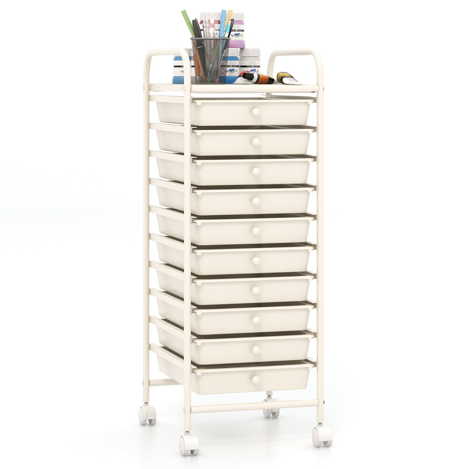 x● 10 removable drawers for storage and classifications of items● Metal frame and plastic drawers are durable for a long time● 4 universal wheels(2 with lock) for easy movement and improved stability● Drawers slide through metal channels with no resistance● Drawer with a knob for easy operation● Easy to pull or push the cart with 2 handles on the top● Ideal drawer storage cart for home office garage and school● Convenient to clean with soap and a damp cloth● Easy assembly in a short time according to instruction