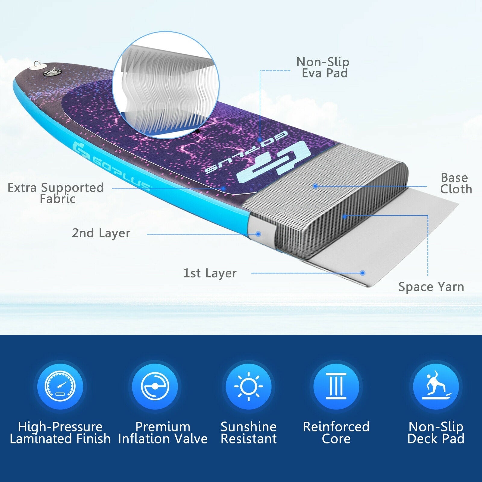 xThe inflatable stand-up paddleboard is ideal for water activities such as padding water yoga fishing and water sunbathing. It can be inflated quickly with the hand pump and deflated with a valve wrench. So you can pack the inflatable sup into a carrying bag with other sup accessories. This board has a large bearing capacity due to its premium PVC material and drop-stitch construction suitable for more people to ride on. Three removable fins control surfing speeds and directions easily. And widened design makes you keep balance and stable standing on it. A safety leash and non-slip deck provide people of all skill levels with a safe surfing experience. You may want to stand on it for fishing and the bungee cords can fix your necessities in order. If you are dreaming of a cool water experience in summer this sup will be a terrific product for you to choose from! If you are looking for a stand-up paddleboard like that don't hesitate to buy it! Multi-layer PVC material and drop-stitch construction make it durable Non-slip EVA deck enhances friction during surfing The widened design ensures higher stability and balance The floatable aluminum paddle could be adjusted to fit all users A waterproof carrying bag is included for easy storage and transportation A convenient handle allows users to carry this lightweight SUP easily A leash could effectively improve safety Complete sup accessories are essential and practical for water activities Perfect for water surfing water yoga sunbathing fishing and so on