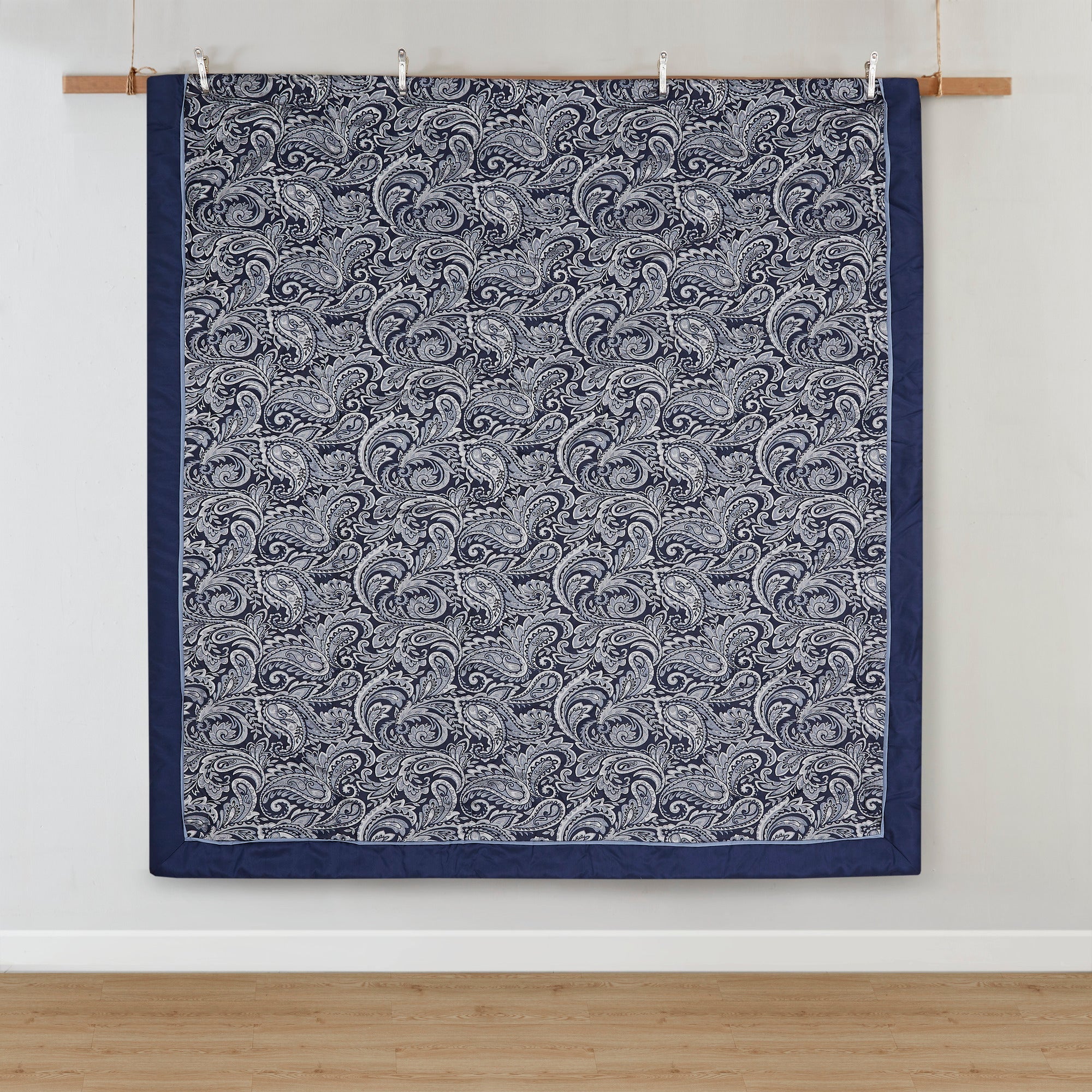 - Polyester comforter and decorative elements with a jacquard weave paisley pattern in navy, medium blue, and silver accents.