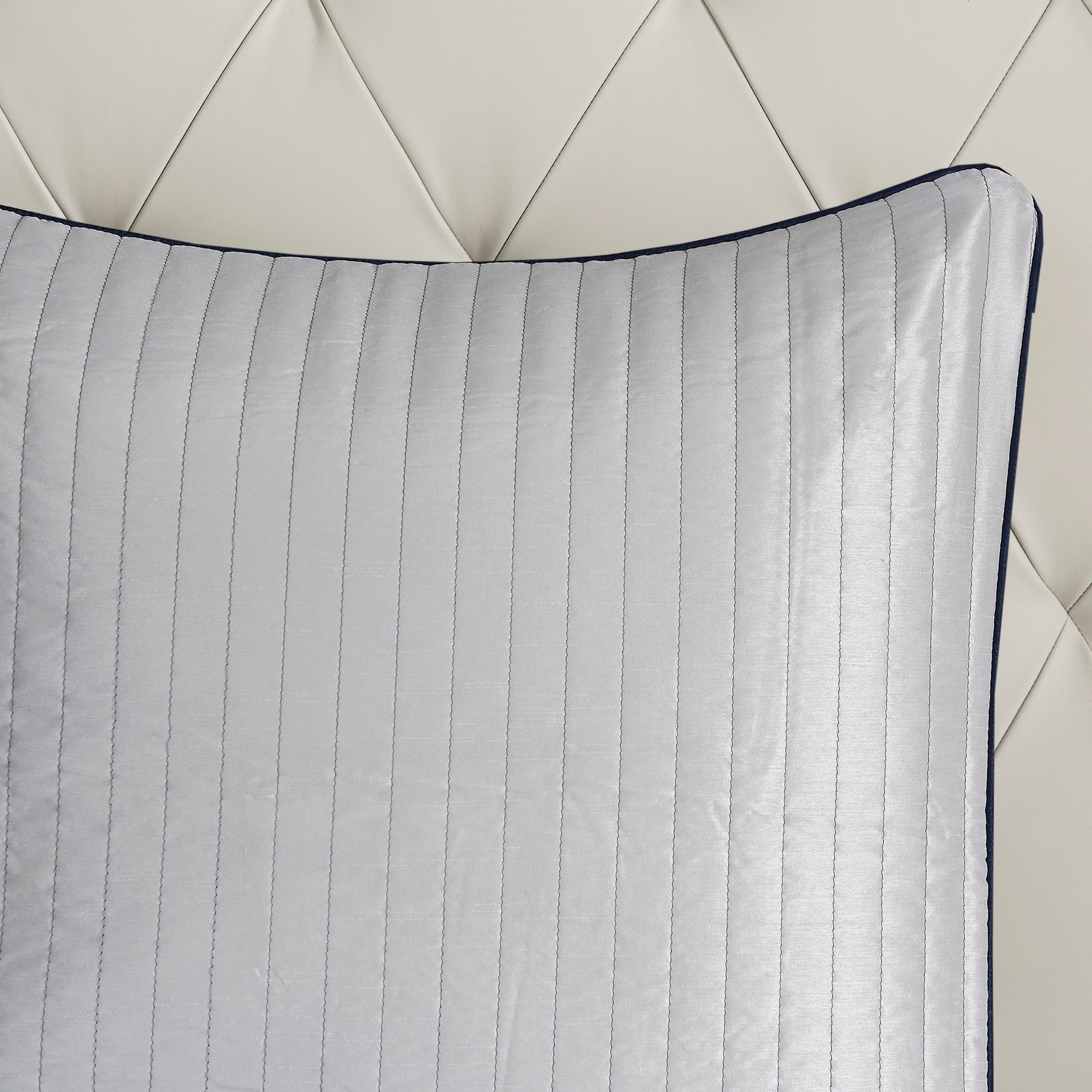 - Elegant navy color accented with hints of silver and soft blue piping
