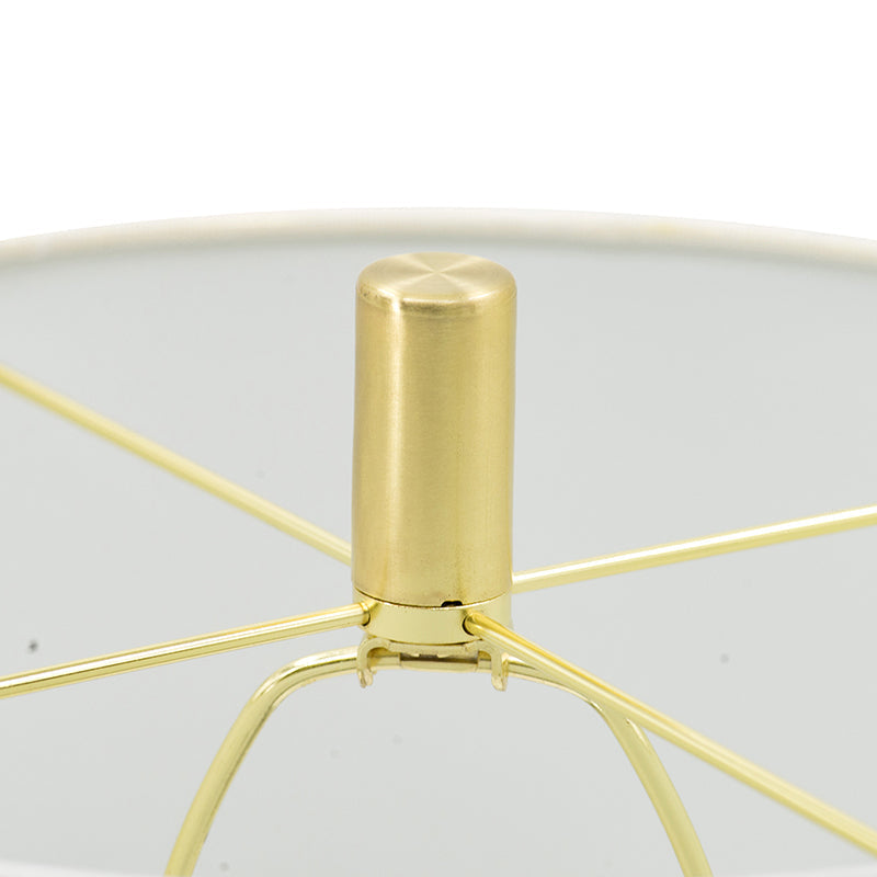 - Features a white fabric drum shade topped with a brass finial for a timeless look