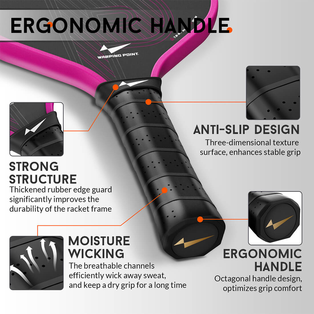 Featuring a 5.5-inch handle with a 4.25-inch circumference, pickleball paddle ergonomic grip fits naturally in your hand. Wrapped in 360° cushioned foam and sweat-absorbing material, it reduces fatigue and offers better control.