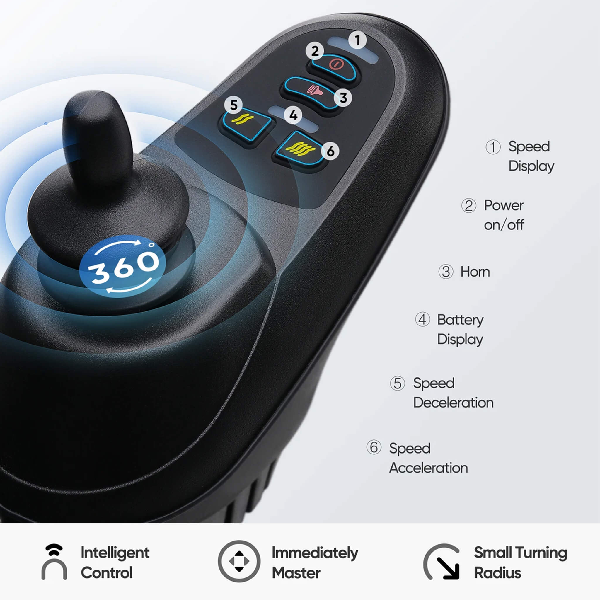 - Equipped with a responsive 360-degree joystick, the wheelchair offers intuitive control, making maneuvering and braking simple and effective, even in confined or tighter spaces.